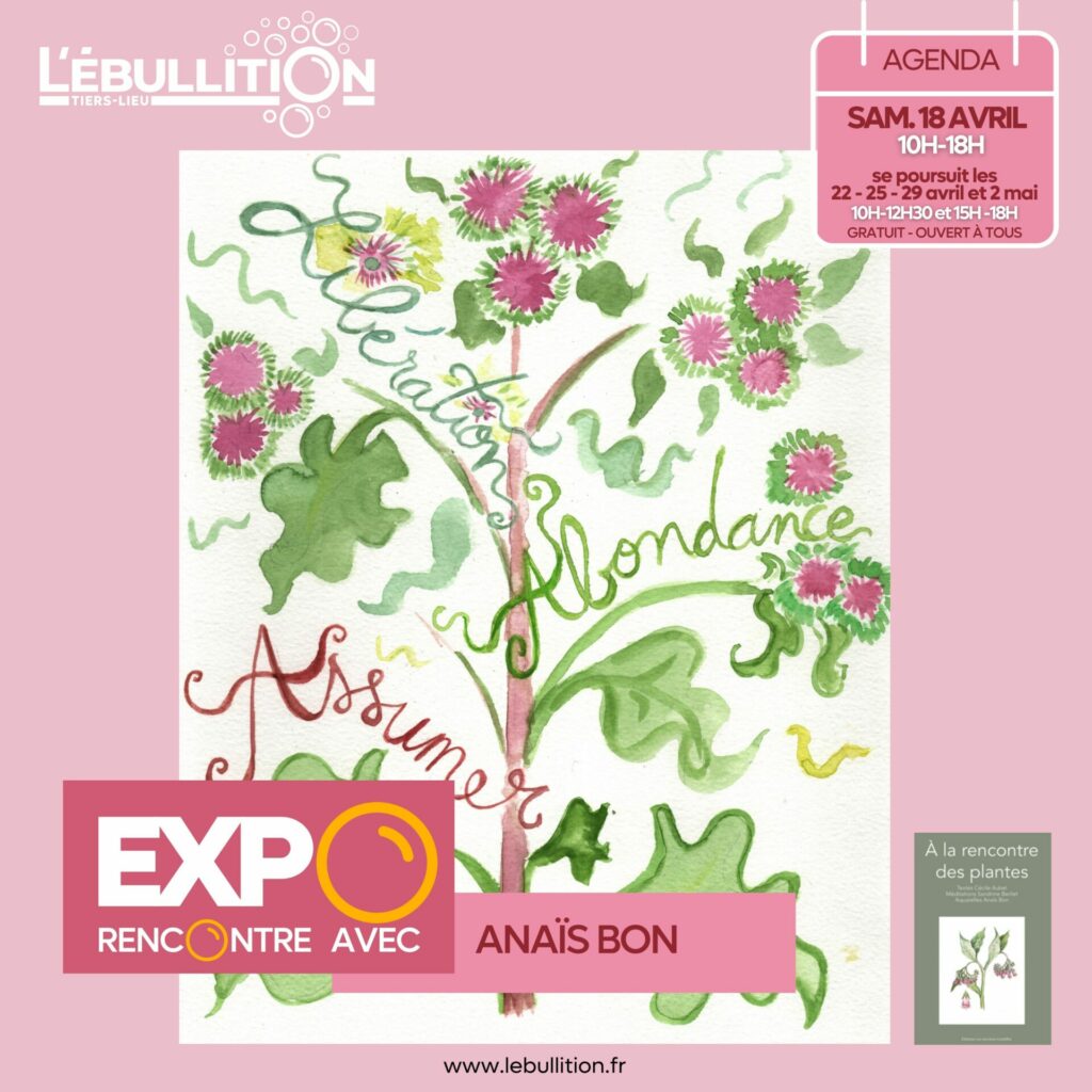Du 18 avril au 2 mai, les aquarelles d’Anaïs Bon s’installent sur les murs de L’Ébullition. Cette exposition présente une sélection d’aquarelles originales d’Anaïs qui illustre le livre À la rencontre des plantes. Chaque plante exposée est représentée par une illustration botanique et une illustration symbolique invitant à la méditation. Une invitation à redécouvrir les plantes sauvages qui nous entourent, discrètes et précieuses compagnes du quotidien.