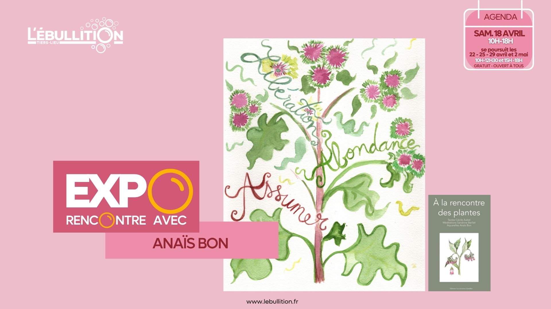 Samedi 18 avril 2026 - 10h à 18h Expo-Rencontre avec Anaïs Bon - “Rencontre avec les plantes” Dans le cadre de L’Ébullition Printanière, notre journée dédiée à la nature et à la biodiversité, nous accueillons sur les murs du tiers-lieu les aquarelles d'Anaïs Bon. Cette exposition présente une sélection d’aquarelles originales d’Anaïs qui illustre le...