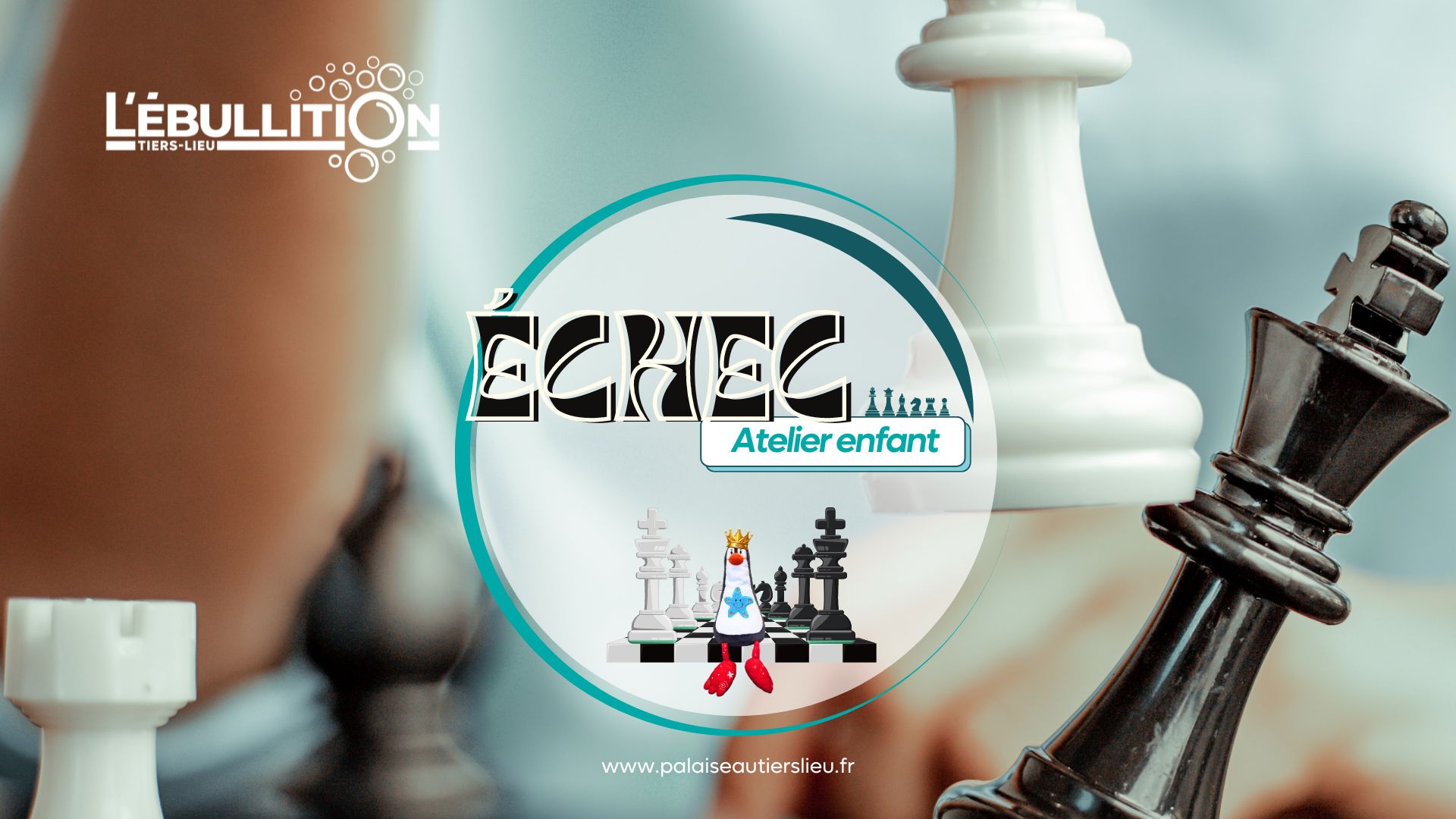 Atelier Échec pour les enfants – à partir de 10 ans – 18h à 19h JUSTE POUR S'AMUSER AUTOUR D'UNE PARTIE D’ÉCHEC.... ... et pourquoi pas progresse un peu. Un vendredi par mois, L’ÉBULLITION accueille les enfants qui aiment jouer aux échecs mais qui ne trouvent pas toujours de partenaires. Ce n'est pas un cours...
