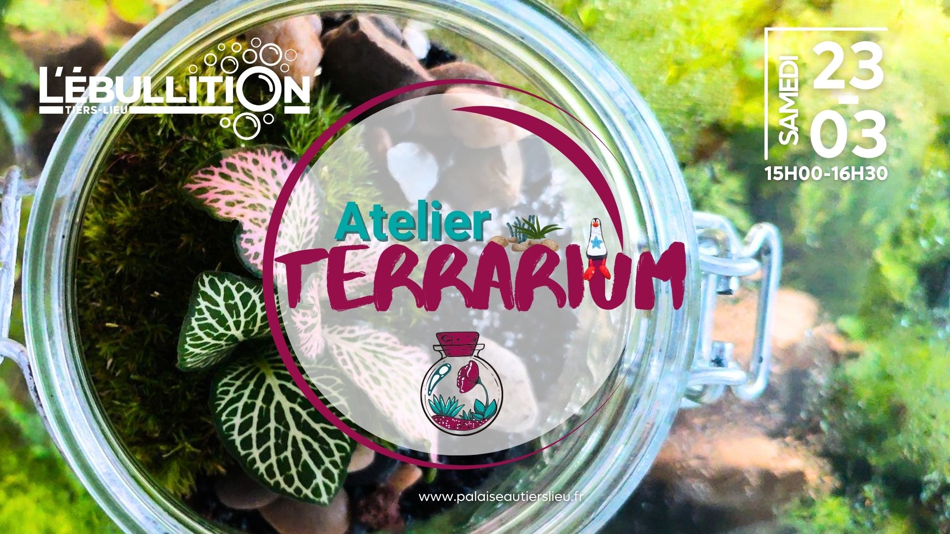 Atelier création d'un terrarium - samedi 23 mars - 15h à 16h30 Antoine, passionné par les écosystèmes minuscules et autosuffisants vous propose un atelier pour prendre le temps de comprendre comment ils fonctionnent. Il partagera son art et vous donnera tous les bons conseils pour réaliser pas à pas votre propre composition végétale dans un...