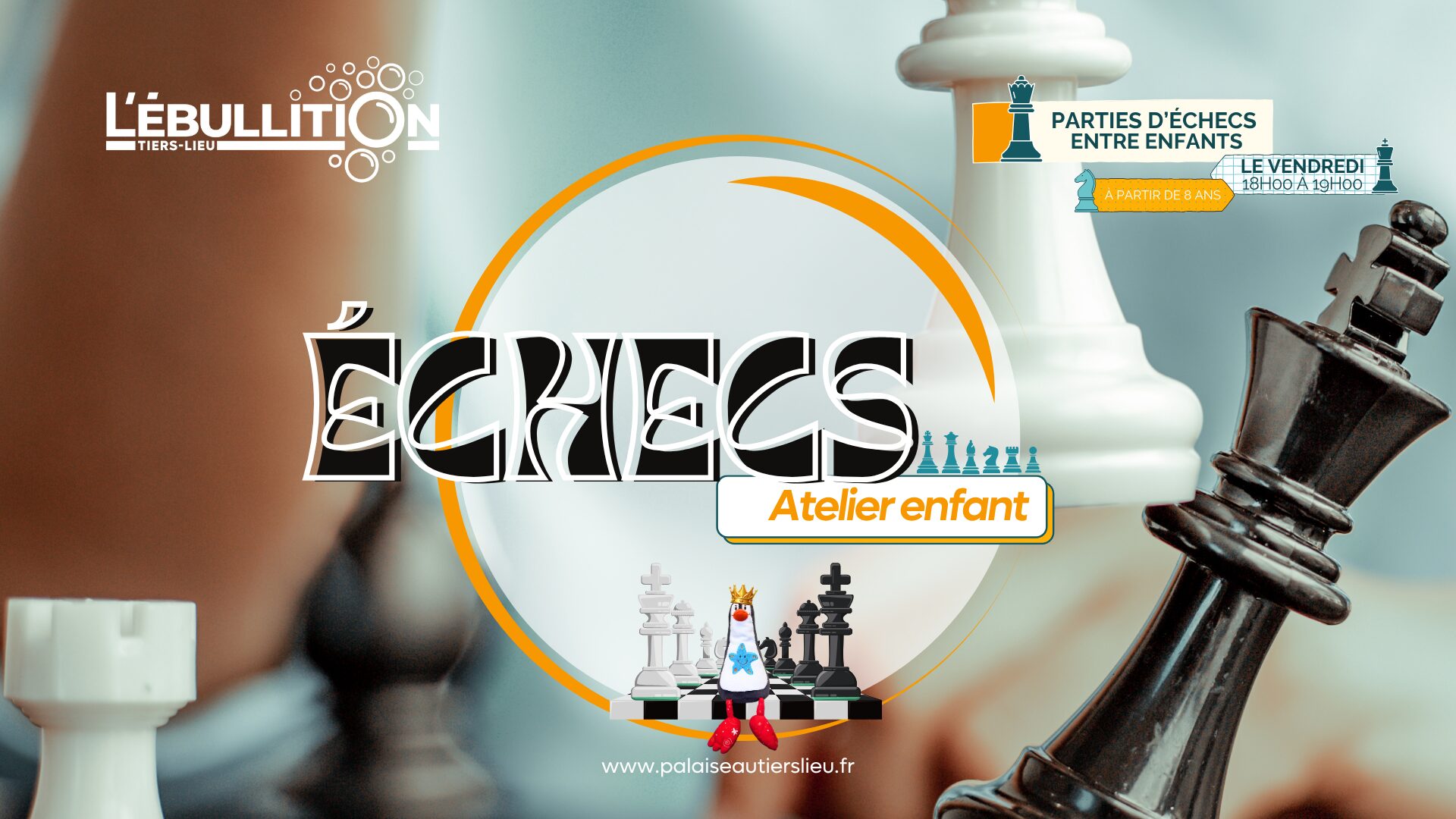 Vendredi 09 janvier 2026 - 18h à 19h - Module 2 (7 séances) Les ateliers ÉCHECS sont des ateliers pour les enfants ( à partir de 8 ans) qui aiment les échecs et qui veulent faire des parties pour le plaisir et améliorer leurs pratiques. Encadrés par des adultes bénévoles de l’association, les enfants se...