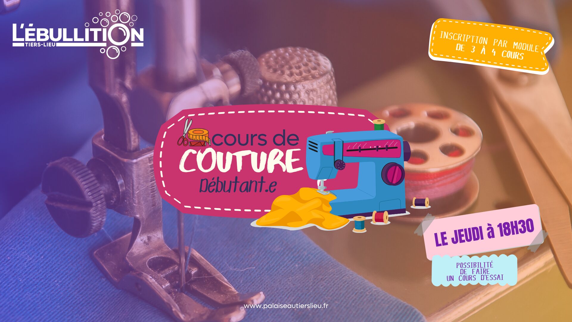 Jeudi 22 janvier 2026 - 14h30 à 17h - Module 2 (3 cours). L’ÉBULLITION relance les cours de couture pour les débutant.es avec Magalie, couturière professionnelle. Ce sont des modules de 3 cours le jeudi tous les quinze jours de 14h30 à 17h. Dans une ambiance conviviale, en petit groupe, Magalie vous proposera des ouvrages...