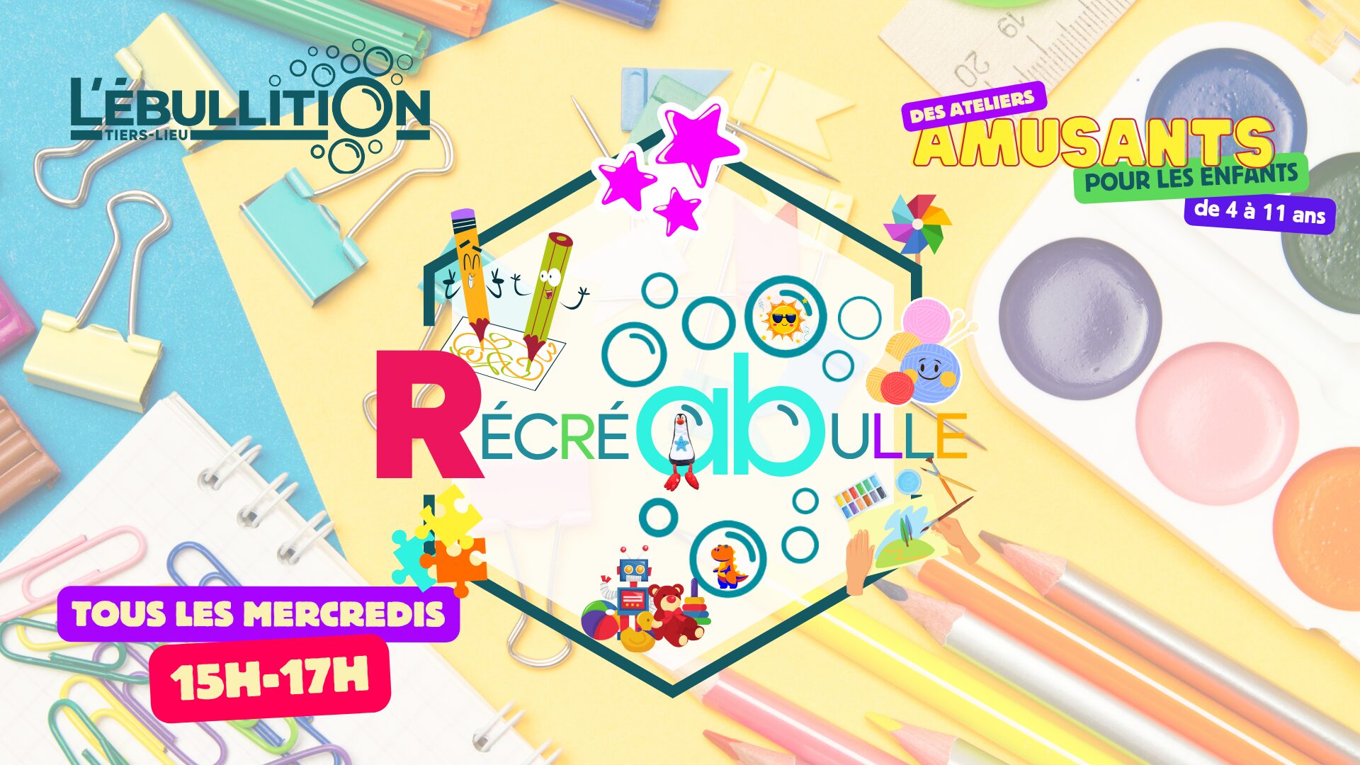 Les Ateliers Récréabulle - Module 3 (7 séances) Mercredi 14 janvier - 15h00 à 17h00 Les ateliers RÉCRÉABULLE, c’est le RDV dedié aux enfants de 5 à 11 ans. C’est un RDV hebdomadaire pour jouer et s’amuser avec d’autres enfants et/ou avec leurs parents/grands parents. C’est un peu la récréation. C’est l’occasion de découvrir une...