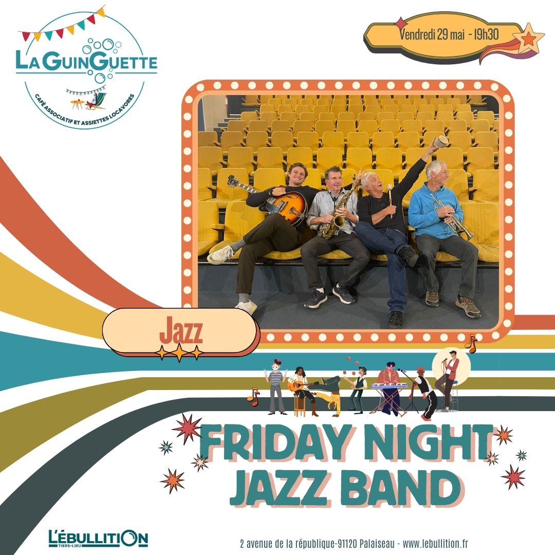 Le Friday Night Jazz Band réunit quatre musiciens — guitare, contrebasse, saxophone et piano — accompagnés de deux voix chaleureuses. Ensemble, ils revisitent des chansons françaises dans une ambiance jazz raffinée et entraînante. Une soirée idéale pour se laisser porter par le swing.