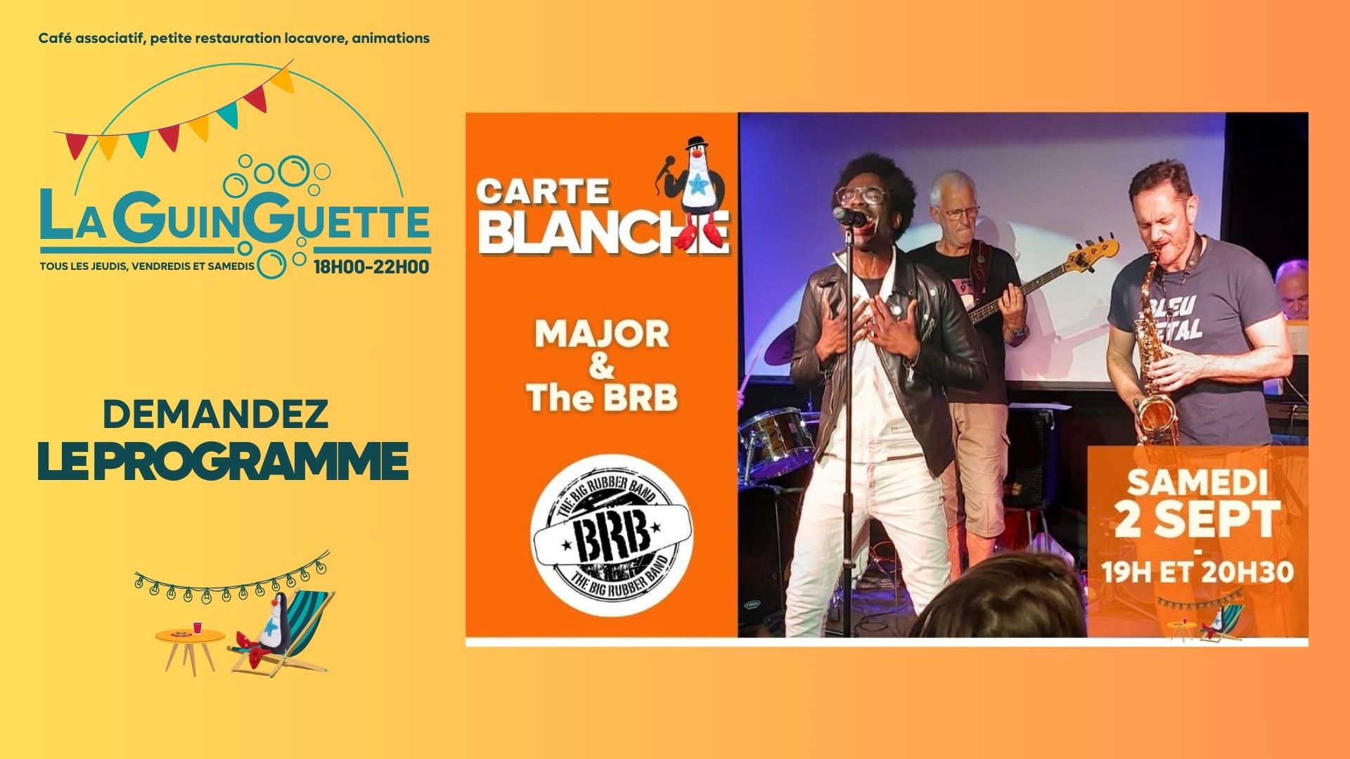 Nous vous propose une programmation musicale avec des artistes amateurs du coin pour animer vos soirées à la Guinguette.
