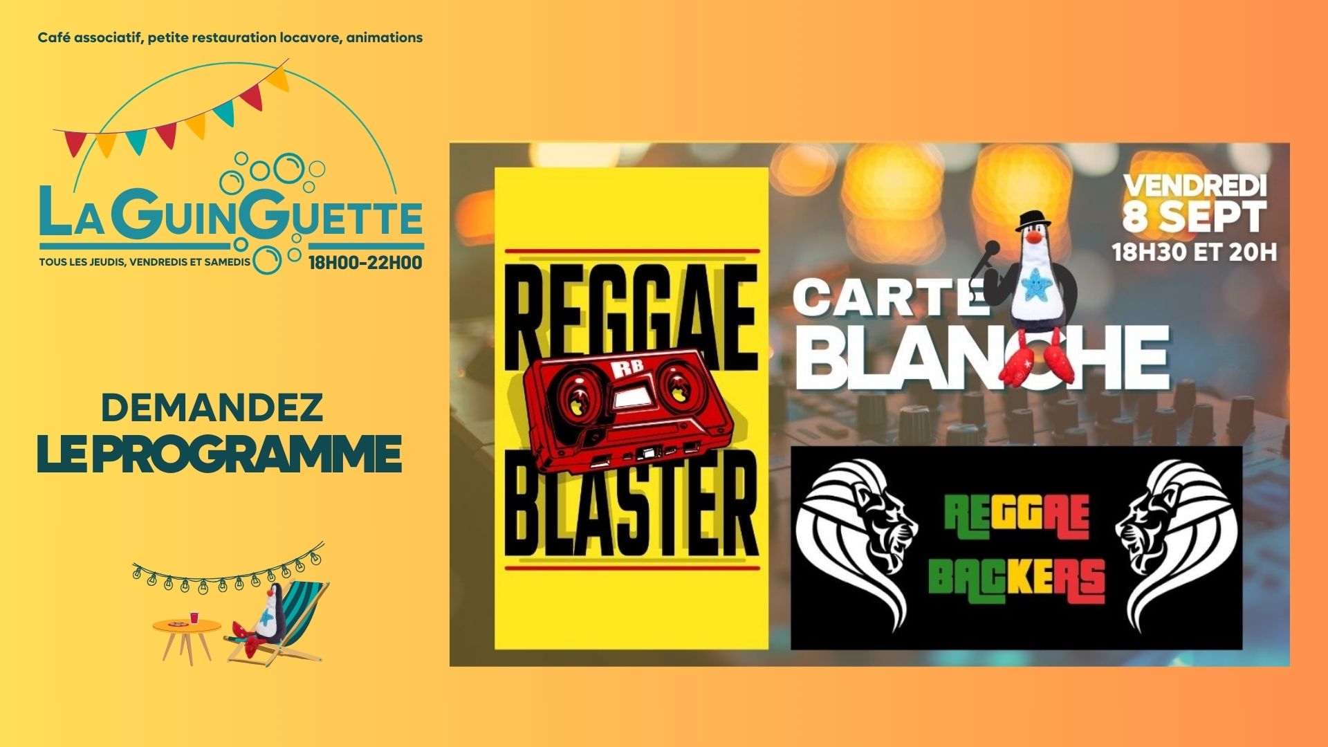 Nous vous propose une programmation musicale avec des artistes amateurs du coin pour animer vos soirées à la Guinguette.