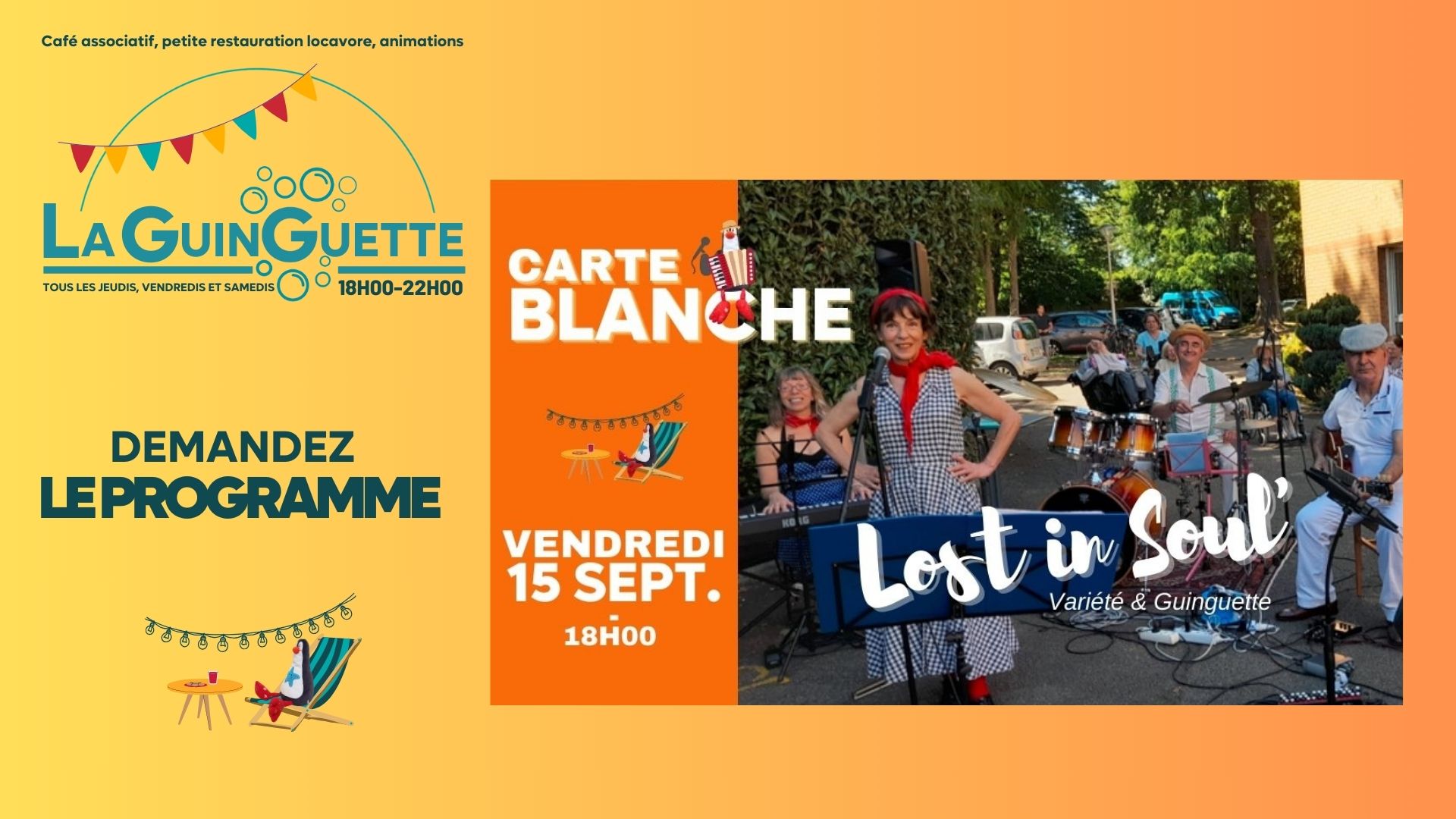 Nous vous propose une programmation musicale avec des artistes amateurs du coin pour animer vos soirées à la Guinguette.