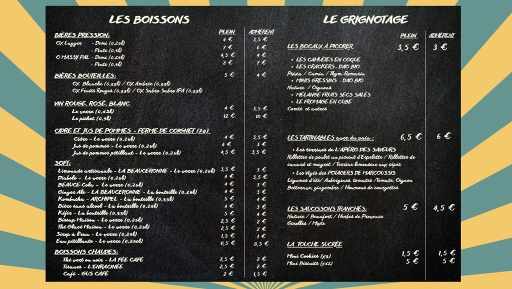 L’ offre est simple. Nous vous proposons des produits les plus en circuit-courts possible, locaux, bio et artisanaux. Nous voulons mettre en valeurs les acteurs locaux et vous faire découvrir leurs produits. Par exemple, vous pourrez déguster l’OX, la bière artisanale et bio de Marcoussis, le pain du Fournil Vandame de Villiers-le-Bâcle, le cidre bio de Coignet…